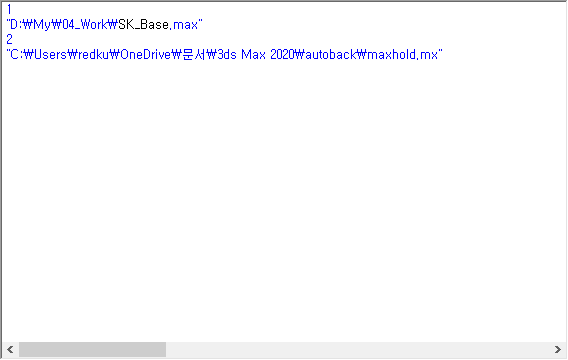 MAXScript Listener에 위와 같이 임시파일 저장이라는 숫자 2와 파일명이 출력됩니다.