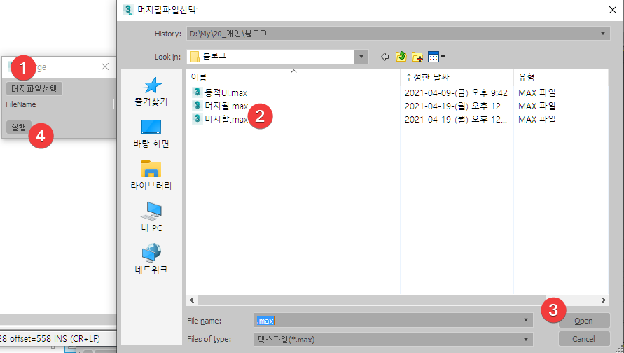 추가된 스크립트 3번 라인의 'mergeMaxFile fileName #select quiet:true'에서 '#select'는 머지된 파일의 오브젝트가 머지가 된 후 해당 오브젝트를 선택 상태가 되록합니다.