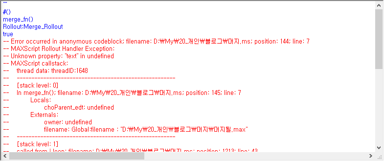 '알 수 없는 속성 : 정의되지 않은 "텍스트"'라고 하는데 이것은 맥스 스크립트의 변수나 정의가 자신의 영역을 넘기지 못하기 때문입니다.