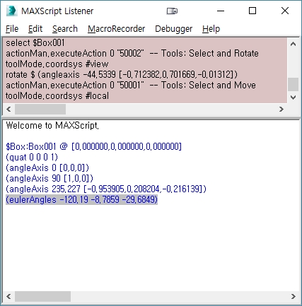 우리가 알고 있는 각도로 표기되며 x축으로 -120.19도 만큼 회전하고, y축으로 -8.7859만큼 회전하며, z축으로 -29.6849만큼 회전한다는 것입니다.