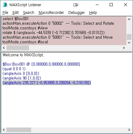 235.227도 만큼 x축으로 -0.953905, y축으로 0.208204, z축으로 -0.216139만큼 회전했다는군요.