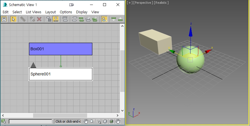 우선 맥스 뷰포트 창에 박스와 스피어를 만들고 스피어를 박스의 자식으로 링크를 건 후에 스피어를 선택합시다.