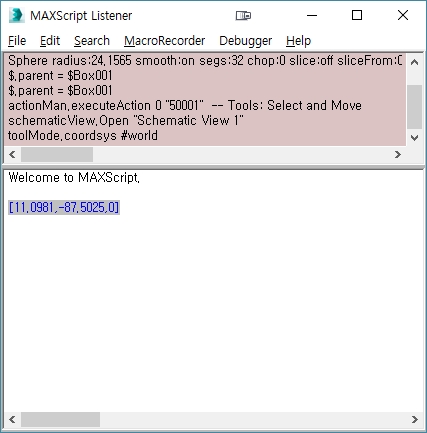 부모(박스) 축 기준으로 위치 값을 확인해 보니 [11.0981,-87.5025,0]라고 나옵니다.