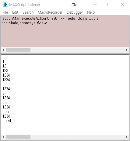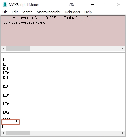 exittext1에 1234를 입력하고 엔터를 친 후 abcd를 입력한 후 MAXScript Listener를 확인해 봅시다.