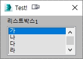 listbox test1_lsb "리스트박스1" items:#("가", "나", "다", "라", "마", "바", "사") height:4