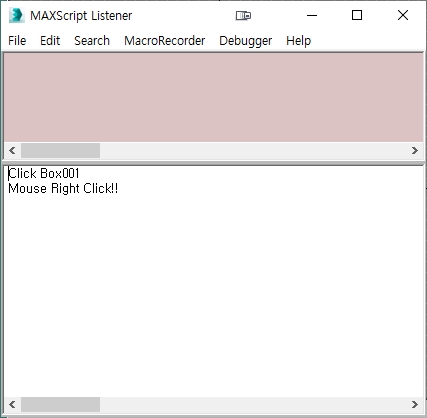 박스를 선택하면 박스가 freeze가 되고 MAXScript Listener에 Click Box001라고 선택된 오브젝트의 이름이 출력됩니다.