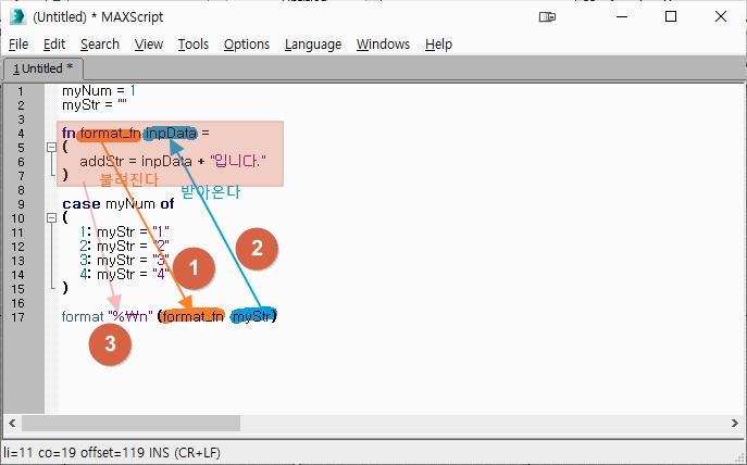 라인 17번 - format문으로 MAXScript Listener에 출력을 합니다.