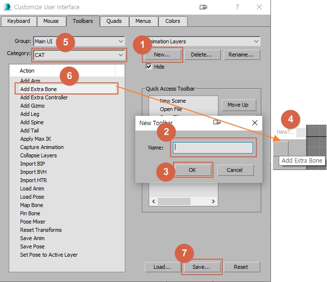 Toolbars탭 > New... > Name에 새로운 Toolbar의 이름 입력 > OK > 툴바가 생성됨 > Category 선택 > 매크로 스크립트 선택 후 새로운 Toolbar에 드래그 > 필요에 따라 Save...