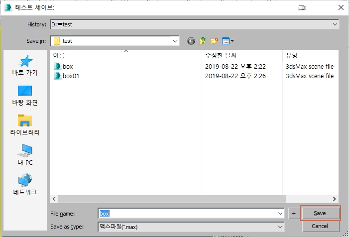 (저는 이전 시간에 만들었던 D드라이브의 test폴더 안에 box.max파일을 사용하겠습니다.)