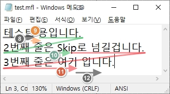 읽는 칸은 다음 줄인 3번째 줄이 아니고 2번째 줄의 마침표 다음에 위치합니다.(엔터와 같은 효과는 없습니다.)