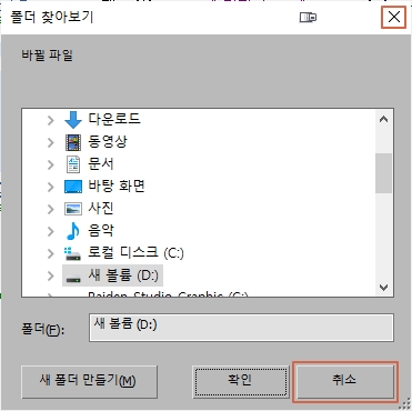 위 다이얼로그 창이 떴을 때 '취소'또는 'X'버튼을 누르면