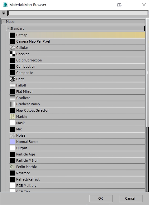 BitmapTexture (), Camera_Map_Per_Pixel (), Cellular (), Checker (), Color_Correction (), Combustion (), Composite (), Dent (), Falloff (), FlatMirror (), Gradient (), Gradient_Ramp (), MultiOutputChannelTexmapToTexmap (), Marble (), Mask (), Mix (), Noise (), Normal_Bump (), Output (), Particle_Age (), Particle_Mblur (), Perlin_Marble (), Raytrace (), Reflect_Refract (), RGB_Multiply (), RGB_Tint (), Smoke (), Speckle (), Splat (), Stucco (), Substance (), Swirl (), Thin_Wall_Refraction (), Bricks (), Vector_Displacement (), Vector_Map (), Vertex_Color (), Water (), Wood ()
